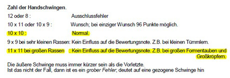 Somit sollte es bei ansonsten gleichwertigen Tieren den Vorzug für zehn Handschwingen geben, eine Abwertung von Tieren mit elf (oder neun) Schwingen (sogar unsymmetrisch) ist jedoch nicht möglich.