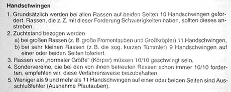 Die Recherche in den allgemeinen Richtlinien des deutschen Verbandes (»Oranger Ordner«) offenbart, dass nur »weniger als 9 und mehr als 11 Handschwingen« als Ausschlussehler zu werten sind.